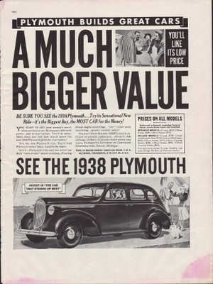 Title (ebay affiliate link): 1938 PLYMOUTH "MUCH BIGGER VALUE" Advertisement