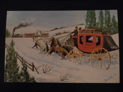Title (ebay affiliate link): Christmas Postcard from US Mail Carrier, Wells Fargo Stage Coach, Train, Winter