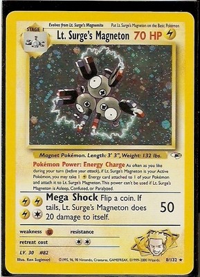 Title (ebay affiliate link): Pokemon Gym Heroes: LT. SURGE'S MAGNETON Rare Holographic Card # 8