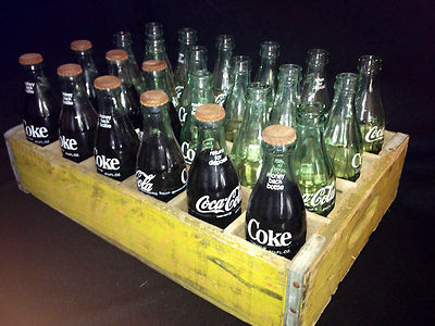 Title (ebay affiliate link): Vintage Coca Cola Yellow Wooden Crate with 24 Vintage Coke Bottles