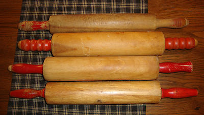 Title (ebay affiliate link): 4 lot vintage antique wood rolling pins chippy red handles original paint