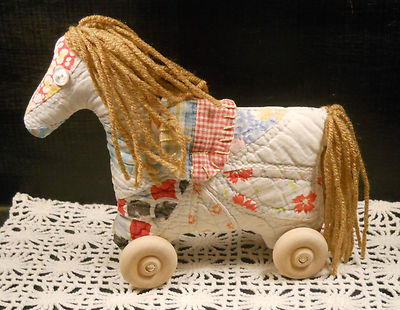 Title (ebay affiliate link): Primitive HORSE on Wooden Wheels ORNIE handmade from ANTIQUE QUILT Shelf Sitter