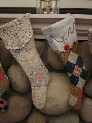 Title (ebay affiliate link): Set of 2 Antique Quilt Stockings ~ Accented with Vintage Lace and buttons