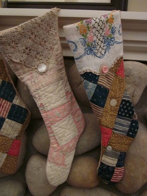 Title (ebay affiliate link): Set of 2 Antique Quilt Stockings ~ Accented with Vintage Lace and buttons
