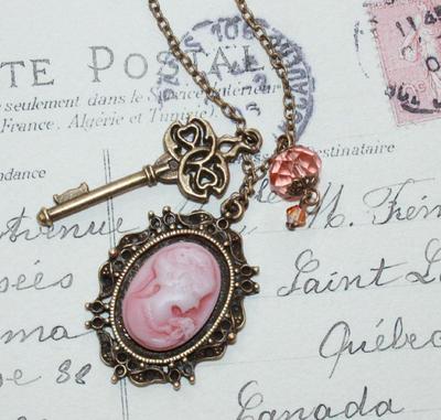Title (ebay affiliate link): CAMEO CHARM NECKLACE WITH KEY & CRYSTAL STEAMPUNK VINTAGE ANTIQUE STYLE 24"