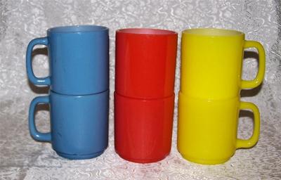 Title (ebay affiliate link): Glasbake Vintage Set of 6 Mugs Colorful Milk Glass Blue Red Yellow