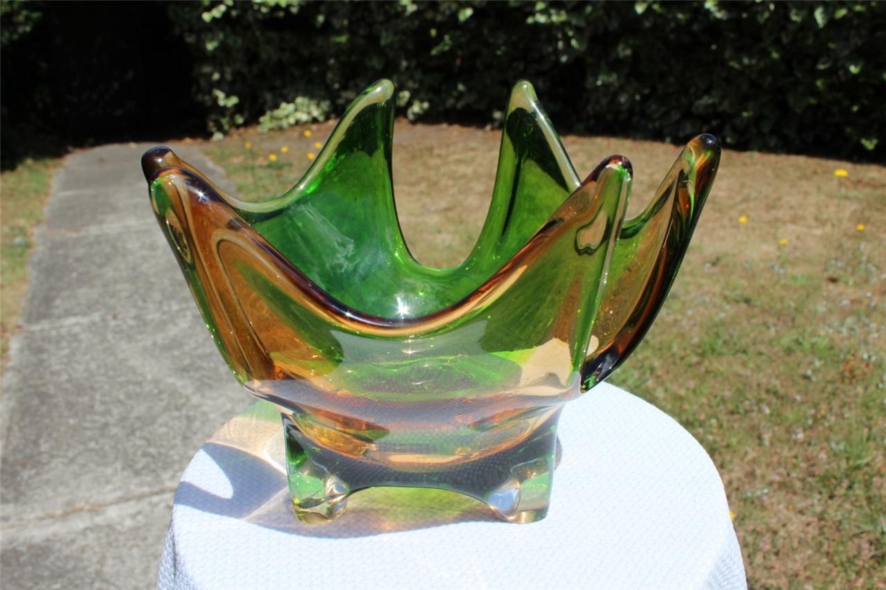 VINTAGE FOOTED MURANO SOMMERSO GREEN/YELLOW ART GLASS BOWL