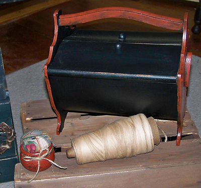 Title (ebay affiliate link): Prim - Vintage Sewing box old spool thread lace & pin cushion