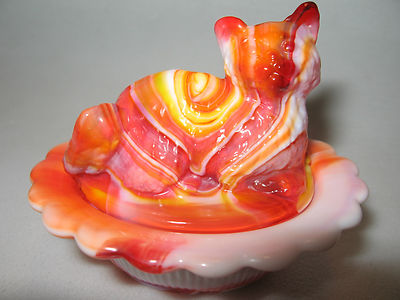 Title (ebay affiliate link): Ruby Red & milk slag glass salt cellar celt cat kitten kitty on nest basket dish