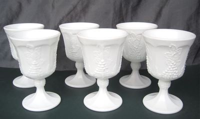 Title (ebay affiliate link): 6 VINTAGE INDIANA HARVEST GRAPE MILK GLASS GOBLETS WINE GLASSES COLONY