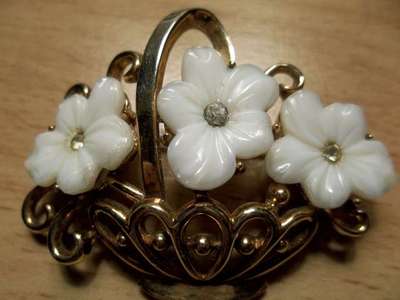 Title (ebay affiliate link): Vintage Flower Basket Brooch Milk Glass Flowers and RS Signed Trifari Pat Pend
