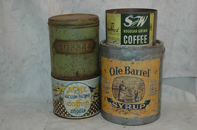 Title (ebay affiliate link): Acme * S&W * COFFEE TIN LOT * Ole Barrel Syrup * Advertising Cans Kitchen decor