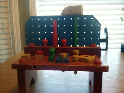 Title (ebay affiliate link): VINTAGE WOODEN TOY WORKBENCH WITH WOODEN HAMMER & PEGS 1940's or 1950's