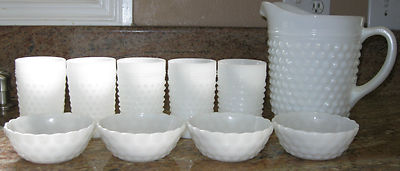 Title (ebay affiliate link): 10 Piece Anchor Hocking Hobnail Milk Glass Pitcher 5 Tumbler Set 4 Bubble Bowls