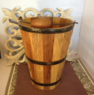 Title (ebay affiliate link): Medium Tall Vintage Wood Wooden Well Water Bucket Wrought Iron Rings Apple Pail