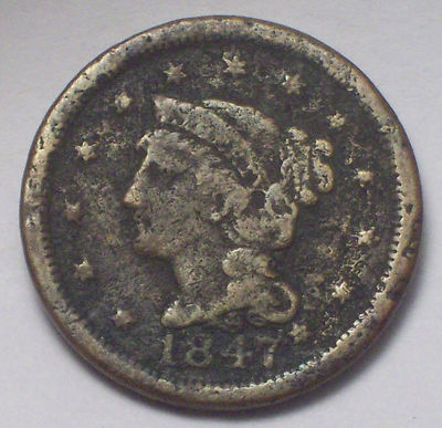 Title (ebay affiliate link): 1847 BRAIDED HAIR CORONET Large Cent *RARE* Authentic US Colonial Antique Coin
