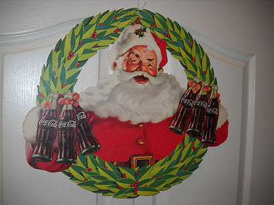 Title (ebay affiliate link): 1958 DIE-CUT CARDBOARD COKE WREATH W/SANTA (2) SIDED HANGER SIGN - RARE IN COND.