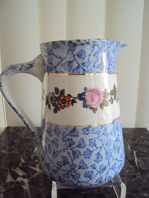 VINTAGE POTTERY PITCHER FLORAL AND BLUE LEAF DESIGN FRANCE