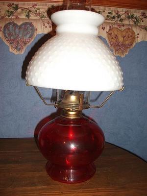 Title (ebay affiliate link): Vtg. Eagle Ruby Red Base Oil Lamp with Hobnail Milk Glass Shade & Chimney