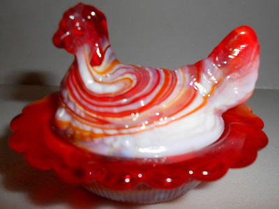 ruby red and milk slag glass salt cellar hen chicken on nest basket dish rooster