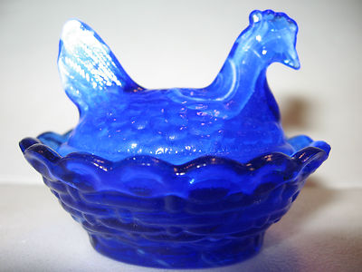 Title (ebay affiliate link): Cobalt blue milk slag glass salt cellar hen chicken on nest basket dish rooster