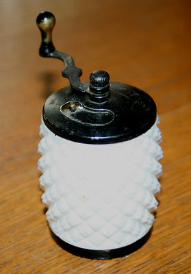Title (ebay affiliate link): VINTAGE MILK GLASS DIAMOND PATTERN PEPPER GRINDER B. THOMPSON CO. CALIFORNIA