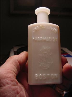 JNO. SULLIVAN PHARMACIST BOSTON MILK GLASS MEDICINE BOTTLE WT & CO. 5"