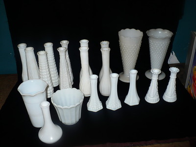 Title (ebay affiliate link): Lot of 20 milk glass bud vases urns stars bars hobnail waffles diamond swirls NR