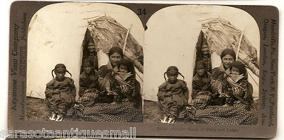 AMERICAN SIOUX INDIANS SITTING OUTSIDE THERE LODGE HOME. KEYSTONE STEREOVIEW