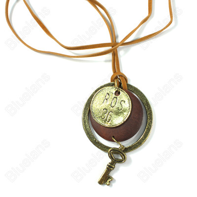 Vintage Faux Leather Rope Ring Wooden Key Chain Necklace 6166