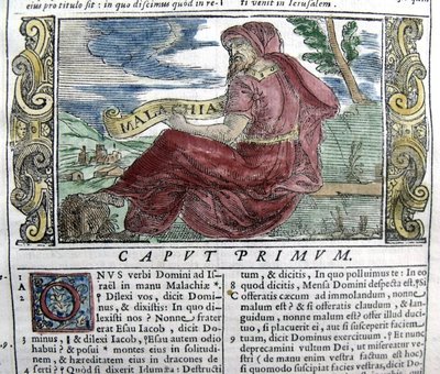 Title (ebay affiliate link): 1547 PROPHET MALACHI Illuminated initial Woodcut BIBLE LEAF Louvain Edition
