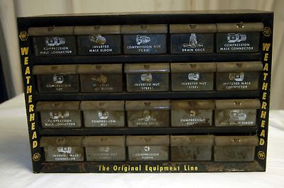 Title (ebay affiliate link): Vintage Weatherhead Parts Display Case Brass Fittings - 20 drawer - Good shape