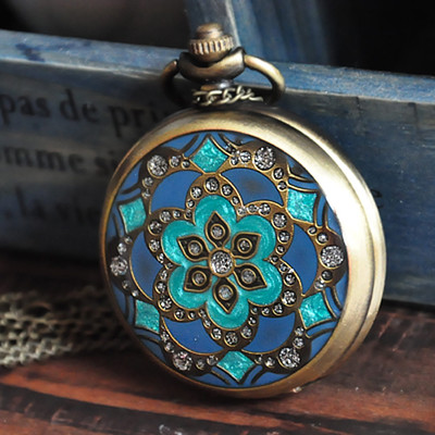 POCKET WATCH CLOCK flower PENDANT LONG NECKLACE