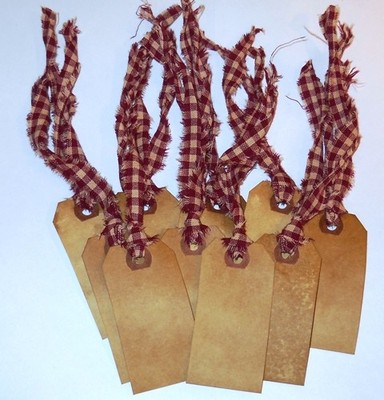 Title (ebay affiliate link): 10 MEDIUM PRIMITIVE HANG TAGS W/ BURGUNDY HOMESPUN FABRIC TIES *FREE SHIP