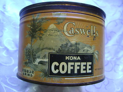 Title (ebay affiliate link): Vintage Caswell's Hawaiian Kona Coffee Tin 1 LB Can San Fransisco Cal Key Wind
