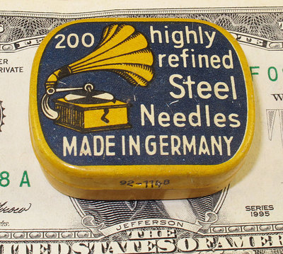 EARLY FLUTED HORN MACHINE BLUE PHONOGRAPH GRAMOPHONE NEEDLE TIN GERMANY