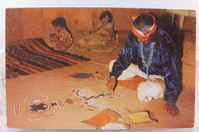 Title (ebay affiliate link): Indian Sand Painting Great Good Spirits Joe Lee Lukachukai Postcard Old Vintage