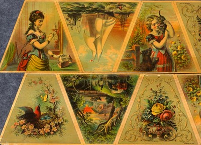 antique lithograph colored scenes 1878 48 pieces cardboard girls women ship bird