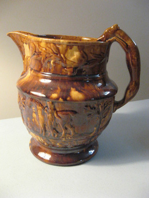 vintage porcelain water pitcher hunting scene-dog handle-ceramic pitcher
