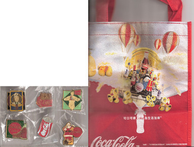 6 Coca-Cola pins plus bonus Tote bag Coke collectables