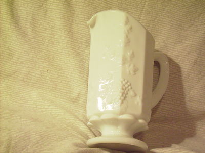 Title (ebay affiliate link): 9" Tall White Footed MILK GLASS Grape Paneled Water Pitcher Westmoreland Style