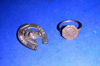 Vintage gumball prize / premium coin ring & "GOOD LUCK" horseshoe ring top