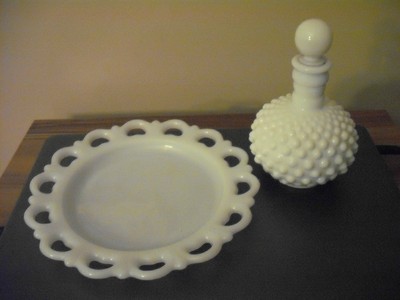 Title (ebay affiliate link): Hobnail Milk glass Perfume Bottle with cork stopper and cut out plate