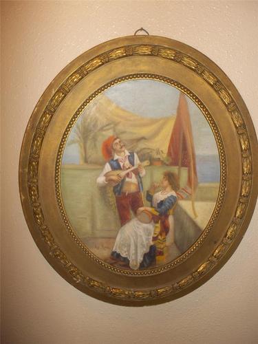 Antique 19th c Oil On Board Painting Signed Man Serenading A Lady