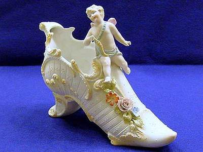 Antique German Large Shoe with CUPID Hand Painted Bisque Figurine Ornate Flowers