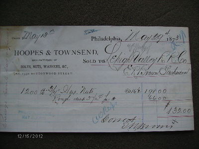 Title (ebay affiliate link): HOOPES & TOWNSEND PHILADLEPHIA 1873 BILLHEAD TO LEHIGH VALLEY RAILROAD
