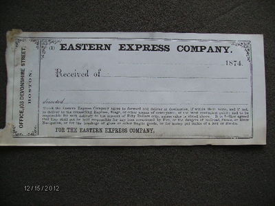 EASTERN EXPRESS COMPANY VINTAGE 1874 RECEIPT, BOSTON