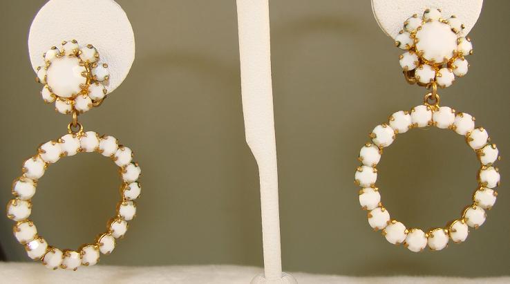 Vtg White Milk Glass Rhinestone Circle Dangle Earrings