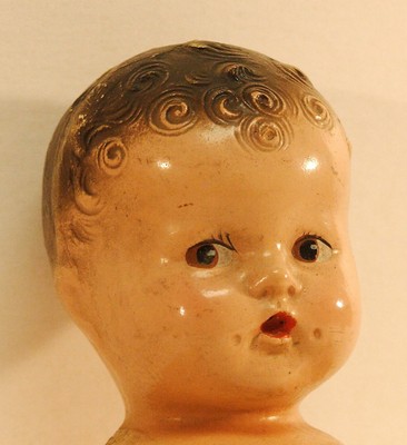 VINTAGE BABY DOLL, JOINTED, PAINTED EYES and LIPS, SCULPTED HAIR, paper mache?