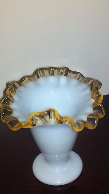 Fenton small white vase with yellow lacing at top in excellent!